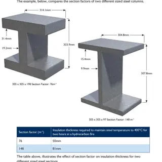 The heat flux or temperature to which the steel is exposed will influence the thickness of insulation required for fire insulation. From the fire tests, tables are constructed using multiple linear regression analysis of the fire test data to relate fire exposure time, section factor and critical temperature to insulation thickness.